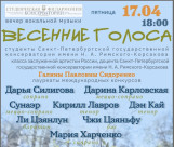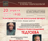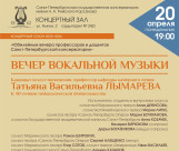 Программа вечера вокальной музыки охватывает целую панораму эпох и стилей. Избранные оперные арии, романсы и песни прозвучат в исполнении студентов класса заслуженной артистки России, доцента Санкт-Петербургской консерватории Г. П. Сидоренко.