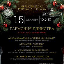 Концерт «Гармония единства» — это музыкальный вечер темброво богатых ансамблей Санкт-Петербургской государственной консерватории им. Н. А. Римского-Корсакова, которые представят произведения, способные объединить разные музыкальные традиции и эпохи, создавая атмосферу единства и гармонии.