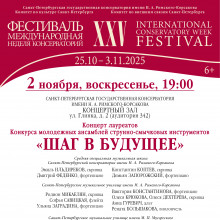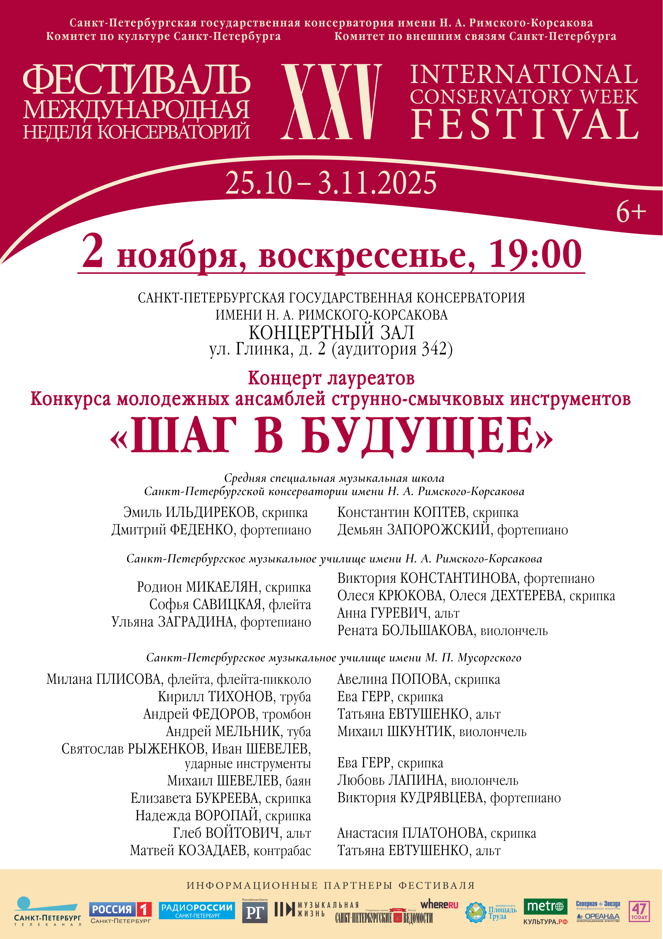 Концерт лауреатов Конкурса «Шаг в будущее – 2024» завершает череду концертов XXV фестиваля «Международная неделя консерваторий». Лауреаты Конкурса — молодые исполнители на струнно-смычковых инструментах, студенты ССМШ, музыальных училищ имени Н. А. Римского-Корсакова и М. П. Мусоргского. В программе концерта:  произведения от академической классики до необычных ансамблевых обработок.