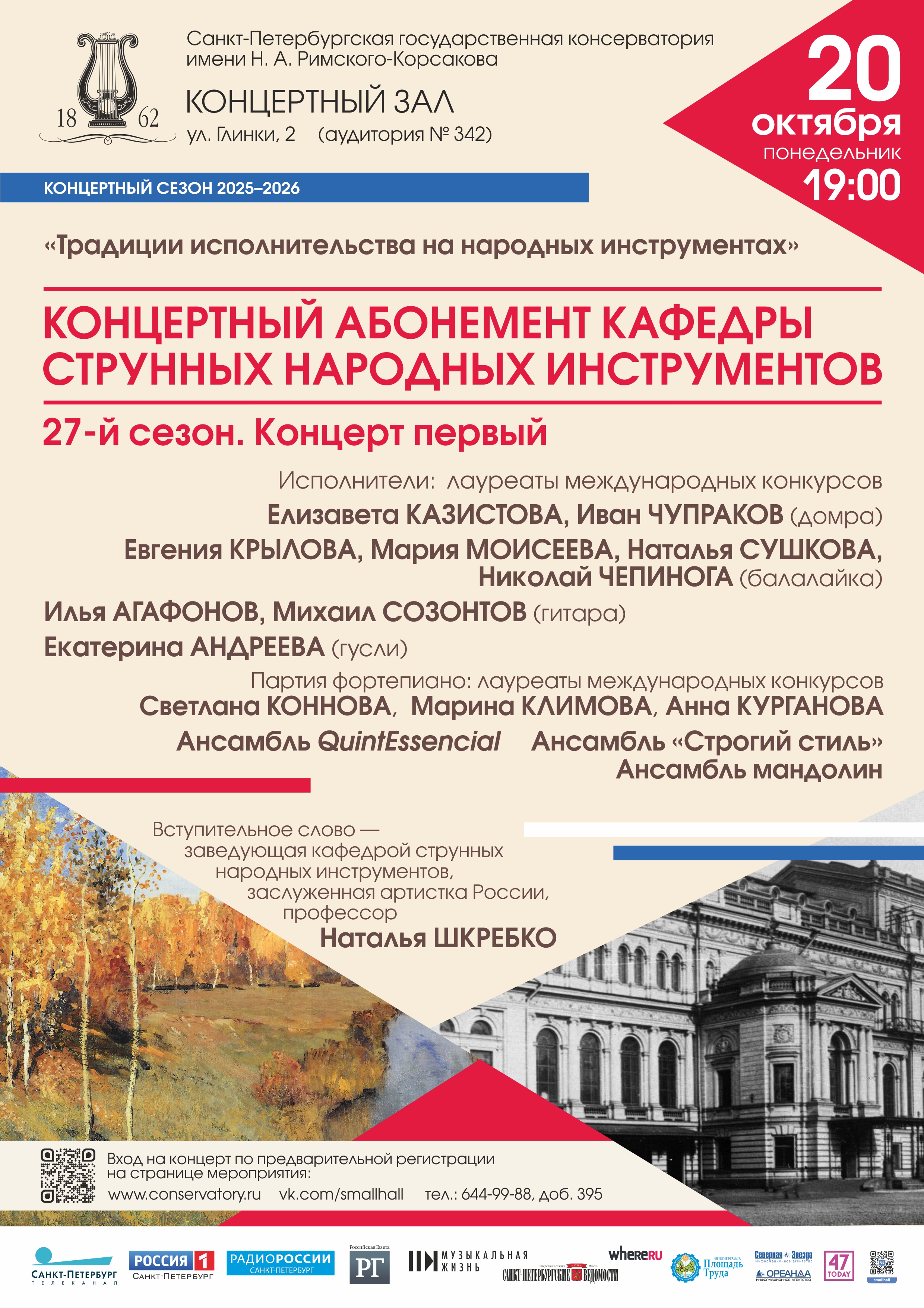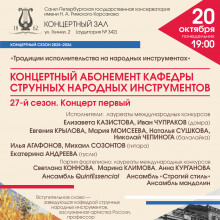 Двадцать седьмой сезон Концертного абонемента кафедры струнных народных инструментов откроется яркой программой, подготовленной студентами факультета народных инструментов разных специальностей. Гости Концертного зала смогут услышать переложения классических сочинений, а также оригинальные композиции для домры, балалайки, гуслей, гитары и ансамбля разных составов. Вступительное слово — заслуженная артистка России, заведующая кафедрой струнных народных инструментов, профессор Наталья Шкребко.