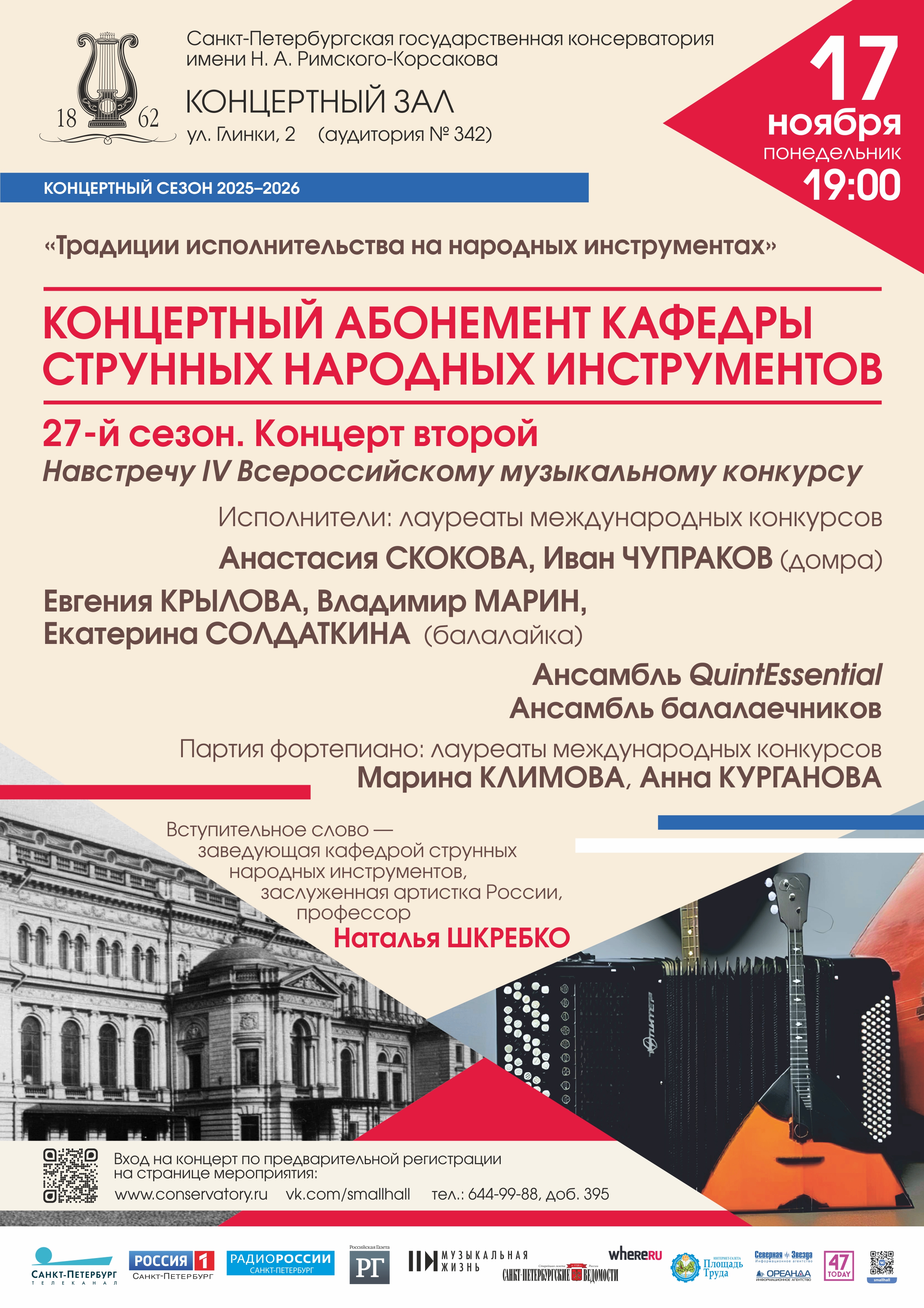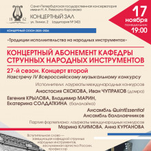 Второй концерт двадцать седьмого сезона Концертного абонемента кафедры струнных народных инструментов приурочен к проведению IV Всероссийского музыкального конкурса. В разножанровой программе прозвучат сочинения для домры, балалайки, а также ансамблей народных инструментов разных составов. Вступительное слово — заслуженная артистка России, заведующая кафедрой струнных народных инструментов, профессор Наталья Шкребко.