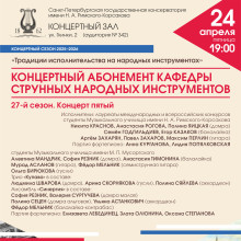 Заключительная встреча в рамках Концертного абонемента кафедры струнных народных инструментов традиционно представит мастерство студентов двух ведущих средних профессиональных учреждений Санкт-Петербурга — Музыкального училища имени Н. А. Римского-Корсакова и Музыкального училища имени М. П. Мусоргского. Студенты народных отделений исполнят обработки классических произведений, а также оригинальные сочинения для домры, балалайки, гитары, гуслей и ансамблей народных инструментов.