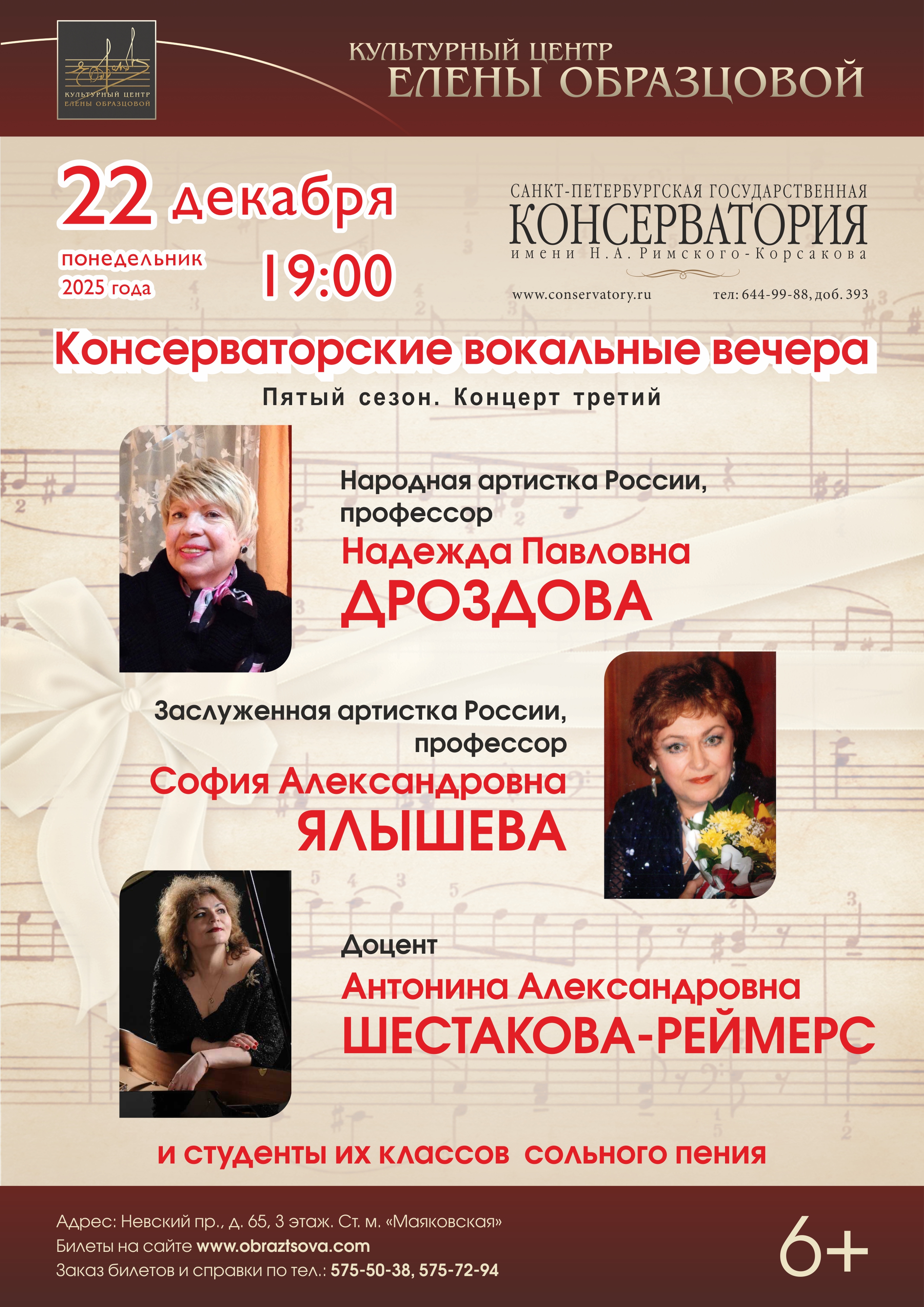 Третья встреча цикла познакомит слушателей со студентами классов сольного пения народной артистки России, профессора Надежды Павловны Дроздовой, заслуженной артистки России, профессора Софии Александровны Ялышевой, а также доцента Антонины Александровны Шестаковой-Реймерс. Молодыми музыкантами будут исполнены шедевры камерно-вокальной и оперной классики.