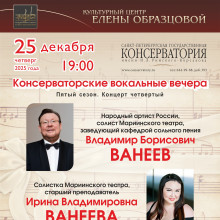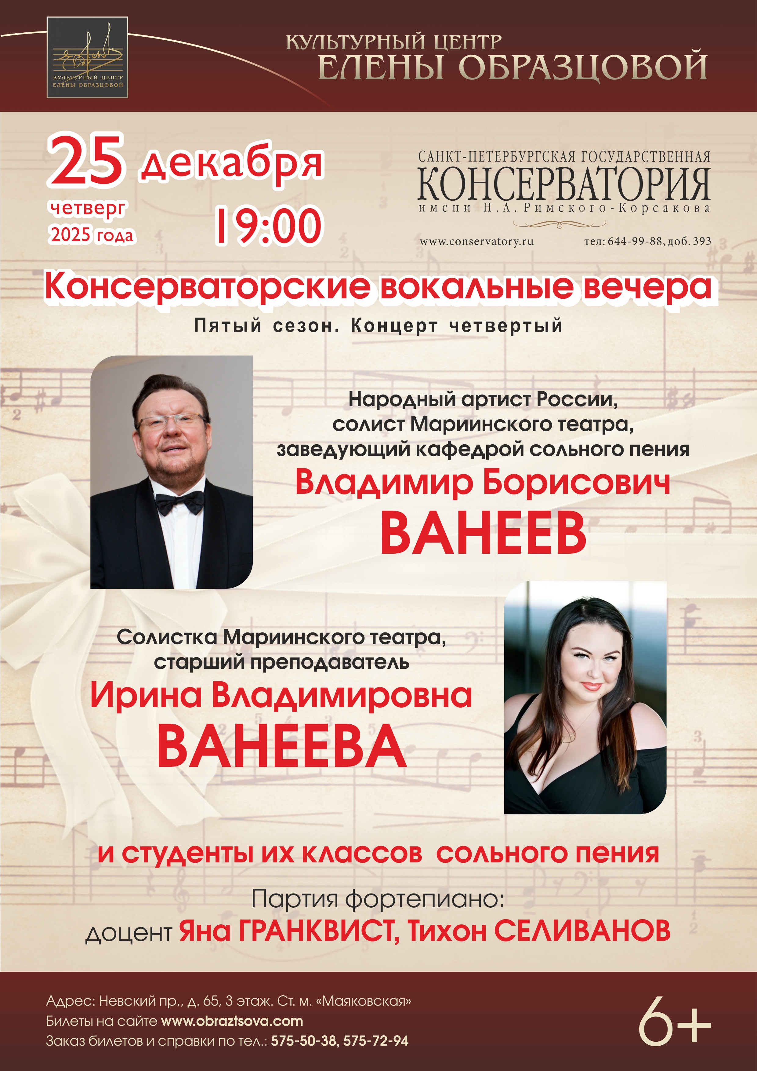 Четвертая программа в цикле «Консерваторские вокальные вечера» продемонстрирует педагогическое мастерство народного артиста России, солиста Мариинского театра, заведующего кафедрой сольного пения Владимира Борисовича Ванеева и солистки Мариинского театра, старшего преподавателя Ирины Владимировны Ванеевой. В исполнении студентов их классов прозвучат арии и романсы композиторов трех веков.