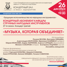 Программа третьего концерта 27-го сезона продолжит знакомить слушателей с представителями семейства струнных народных инструментов. Исполнители на домре, балалайке, гитаре, гуслях, а также Ансамбль мандолин подготовили в преддверии Нового года праздничную программу, в которой прозвучат оригинальные сочинения и обработки известных академических произведений.