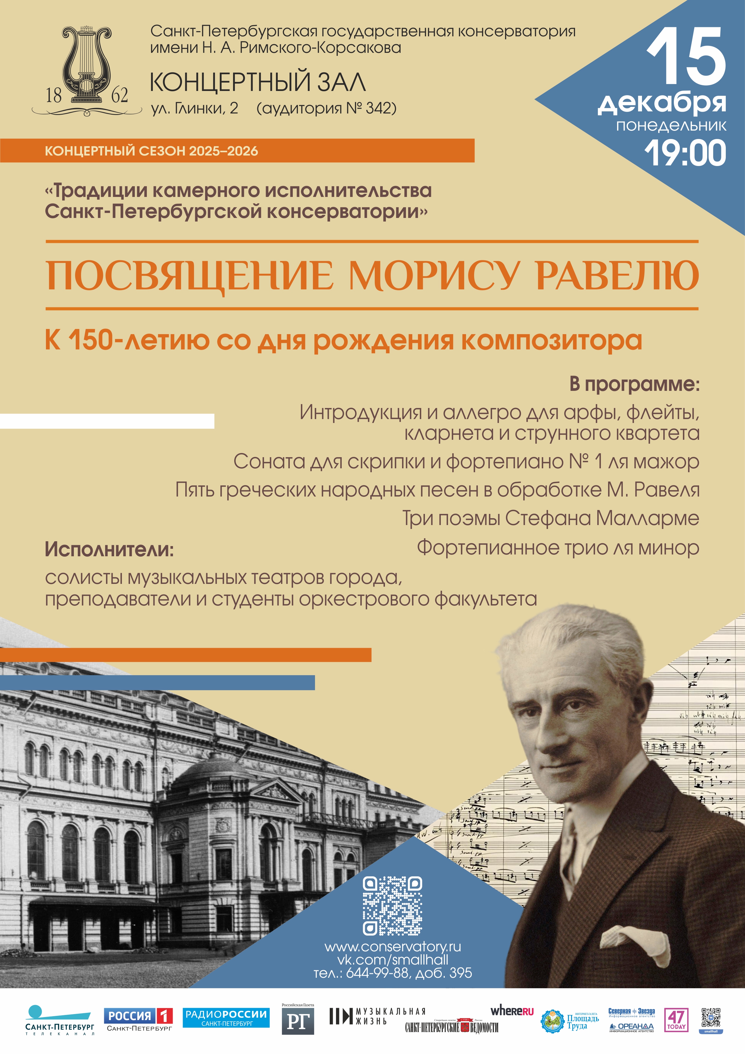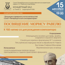 В этом году мировая музыкальная общественность отмечает 150-летие со дня рождения Мориса Равеля (1875–1937). Преподавателями и студентами оркестрового факультета, а также солистами музыкальных театров города будет исполнена программа, которая отражает многогранность творческого облика этого выдающего представителя французской композиторской школы.