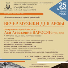 Концертная программа вечера приурочена к 100-летию со дня рождения профессора Ленинградской консерватории Аси Агасьевны ВАРОСЯН (1926–2019). Почтить память Учителя на сцену выйдут студенты и выпускники класса заслуженной артистки России, профессора, артистки ЗКР академического симфонического оркестра Филармонии Анны Александровны МАКАРОВОЙ, а также ученицы Средней специальной музыкальной школы Санкт-Петербургской консерватории классов Карине Григорьевны МАЛЕЕВОЙ и Марины Витальевны СМИРНОВОЙ.