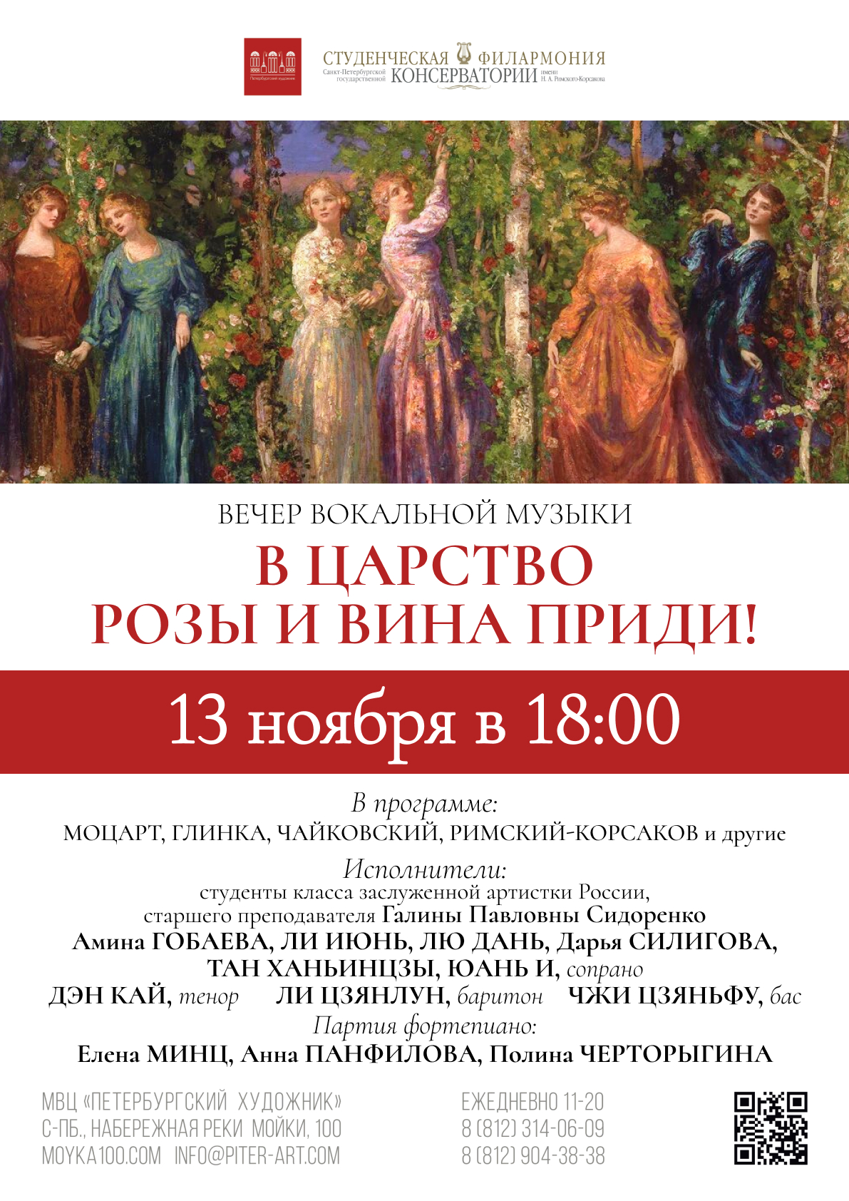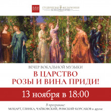Вечер вокальной музыки подарит слушателям праздничное настроение, в яркой программе в исполнении молодых голосов прозвучат арии и романсы Моцарта, Глинки, Чайковского Римского-Корсакова.