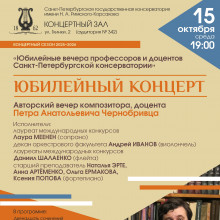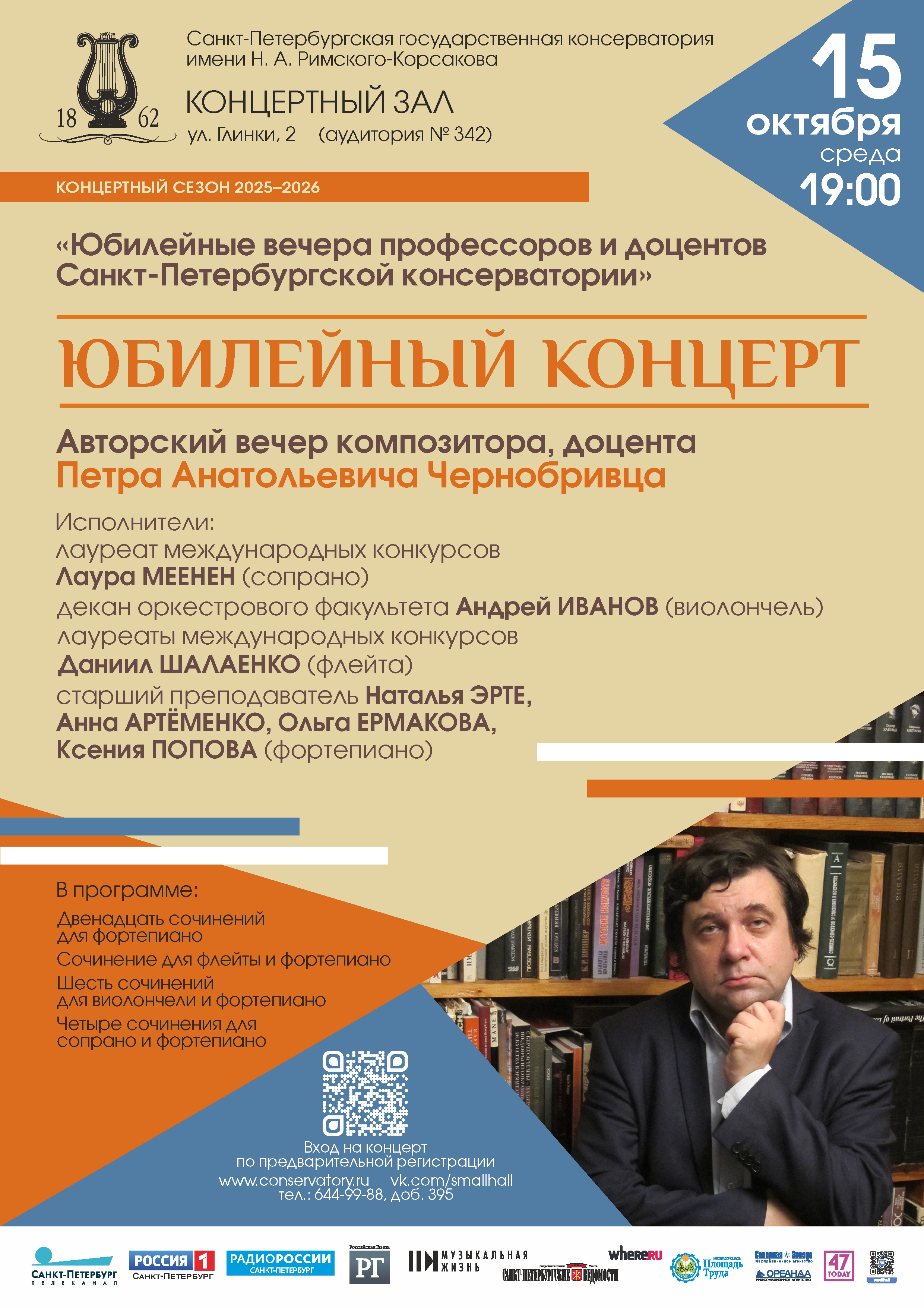 В 2025 году свой юбилей отмечает доцент Санкт-Петербургской консерватории, музыковед и композитор Петр Анатольевич Чернобривец. Ученик выдающегося представителя петербургской музыковедческой школы, профессора Т. С. Бершадской, Петр Чернобривец — автор двух монографий, исследователь в области гармонии, музыкального стиля и эстетики. В рамках авторского вечера на сцене Концертного зала Санкт-Петербургской консерватории прозвучат камерно-вокальные и инструментальные сочинения композитора.