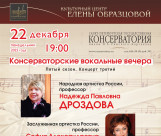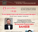 Четвертая программа в цикле «Консерваторские вокальные вечера» продемонстрирует педагогическое мастерство народного артиста России, солиста Мариинского театра, заведующего кафедрой сольного пения Владимира Борисовича Ванеева и солистки Мариинского театра, старшего преподавателя Ирины Владимировны Ванеевой.