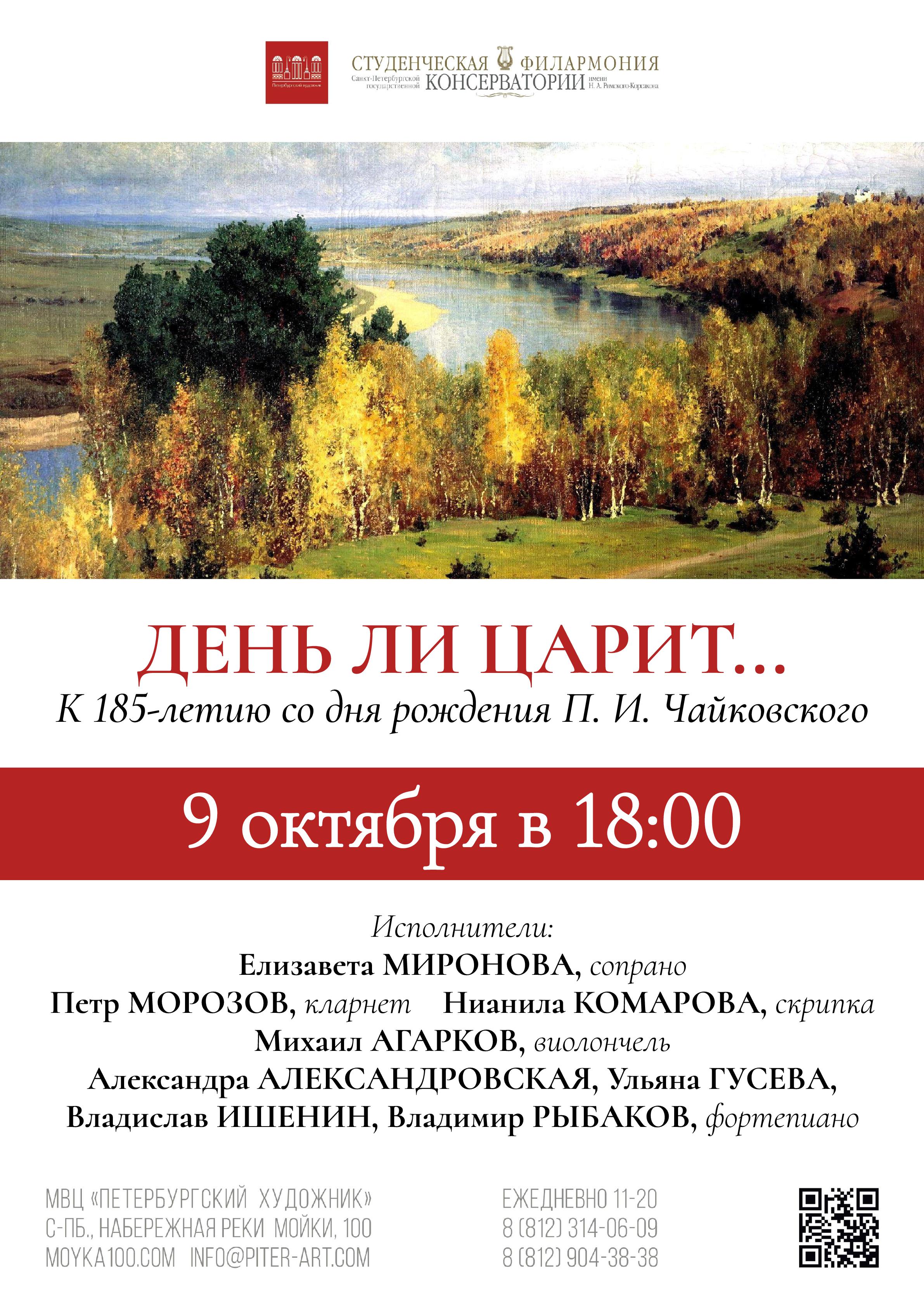 Вечер посвящен 185-летию великого русского композитора XIX века — Петра Ильича Чайковского. Его жизнь была тесно связана с Петербургом и историческим районом Коломна, где и состоится концерт. В программе — избранные фортепианные, ансамблевые и вокальные сочинения, во всем великолепии представляющие камерную сферу творческого наследия Чайковского.