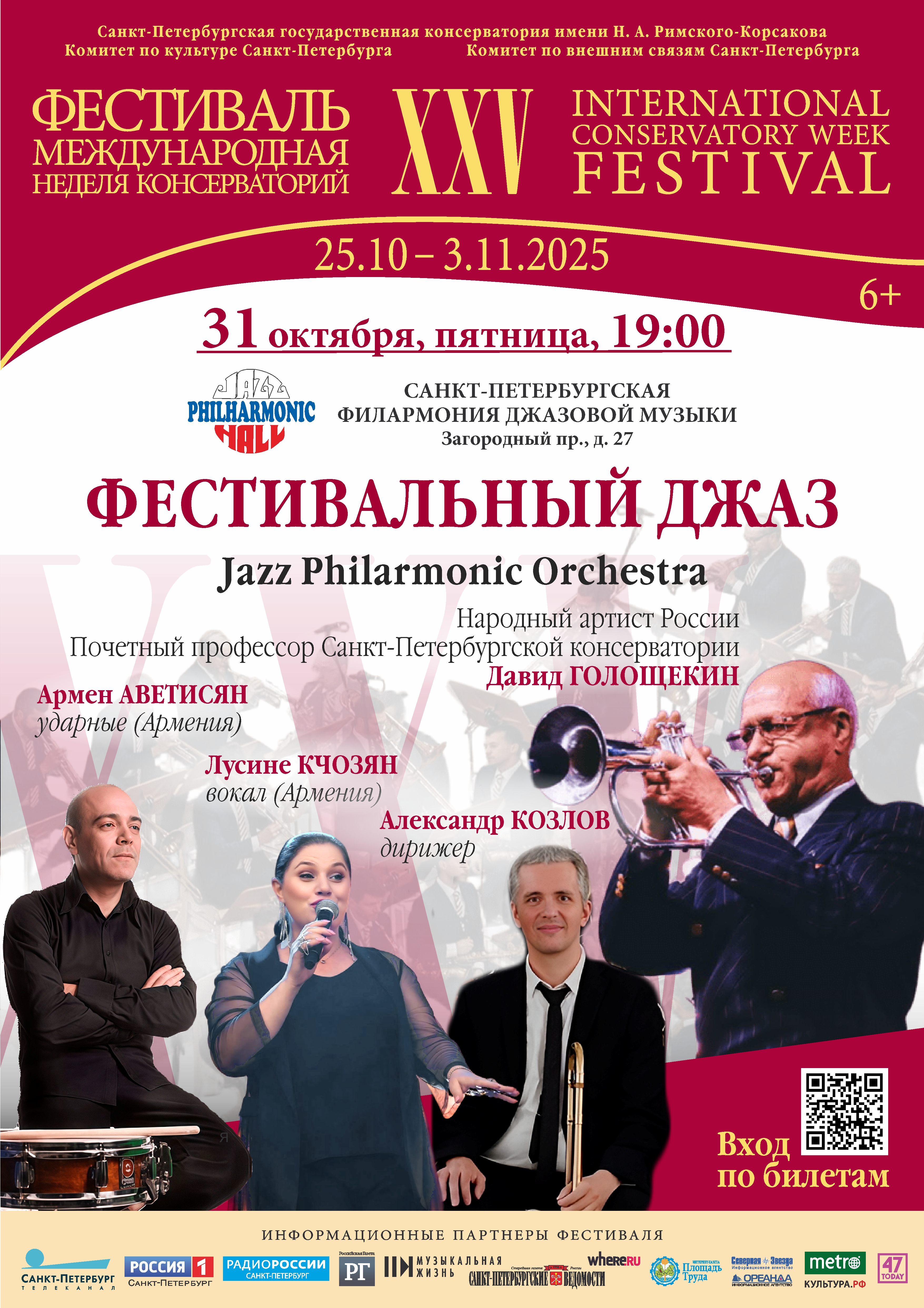 В Филармонии джазовой музыки выступят гости из Армении — джазовая вокалистка Лусине Кчозян и перкуссионист Армен Аветисян. Также в этот вечер на сцену выйдет художественный руководитель Филармонии, народный артист России, Почетный профессор Санкт-Петербургской консерватории Давид Голощекин и Jazz Philharmonic Оrchestra под руководством Александра Козлова.
