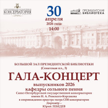 30 апреля в 14.00 в Колонном зале Президентской библиотеки имени Б.Н. Ельцина пройдет гала-концерт выпускников кафедры сольного пения Санкт-Петербургской государственной консерватории. Данное мероприятие уже стало традиционным.