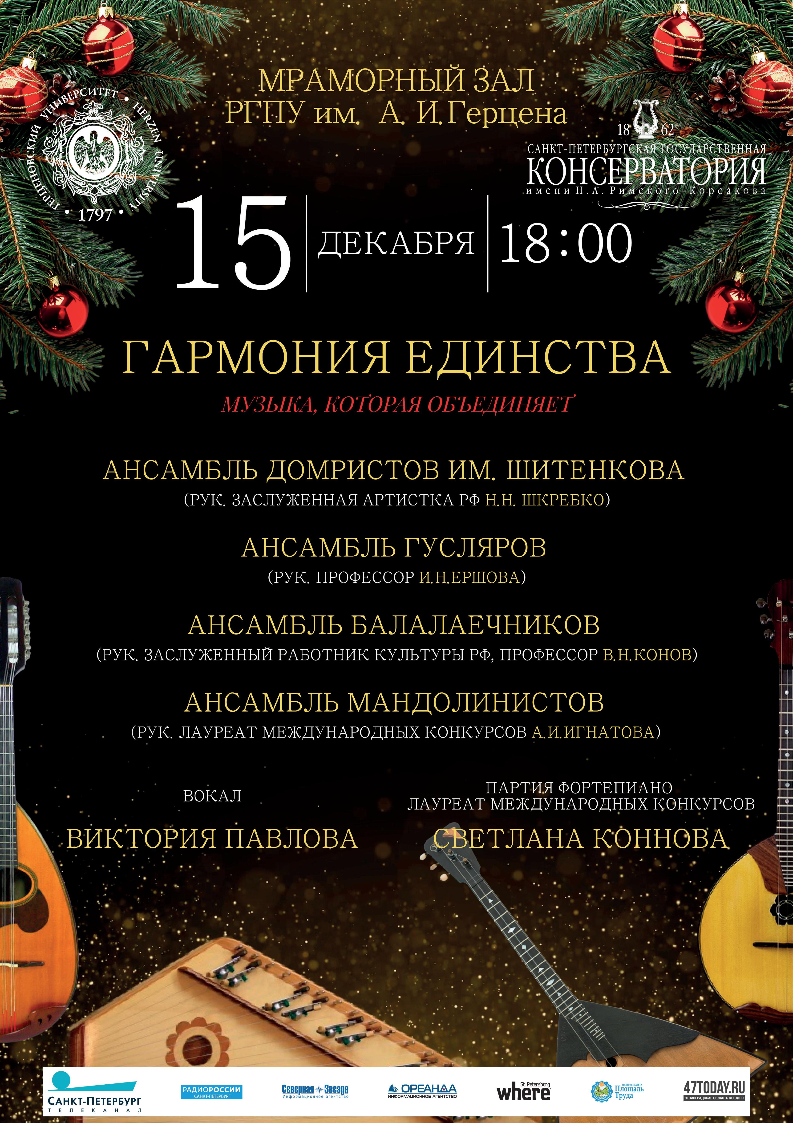 Концерт «Гармония единства» — это музыкальный вечер темброво богатых ансамблей Санкт-Петербургской государственной консерватории им. Н. А. Римского-Корсакова, которые представят произведения, способные объединить разные музыкальные традиции и эпохи, создавая атмосферу единства и гармонии.
