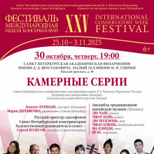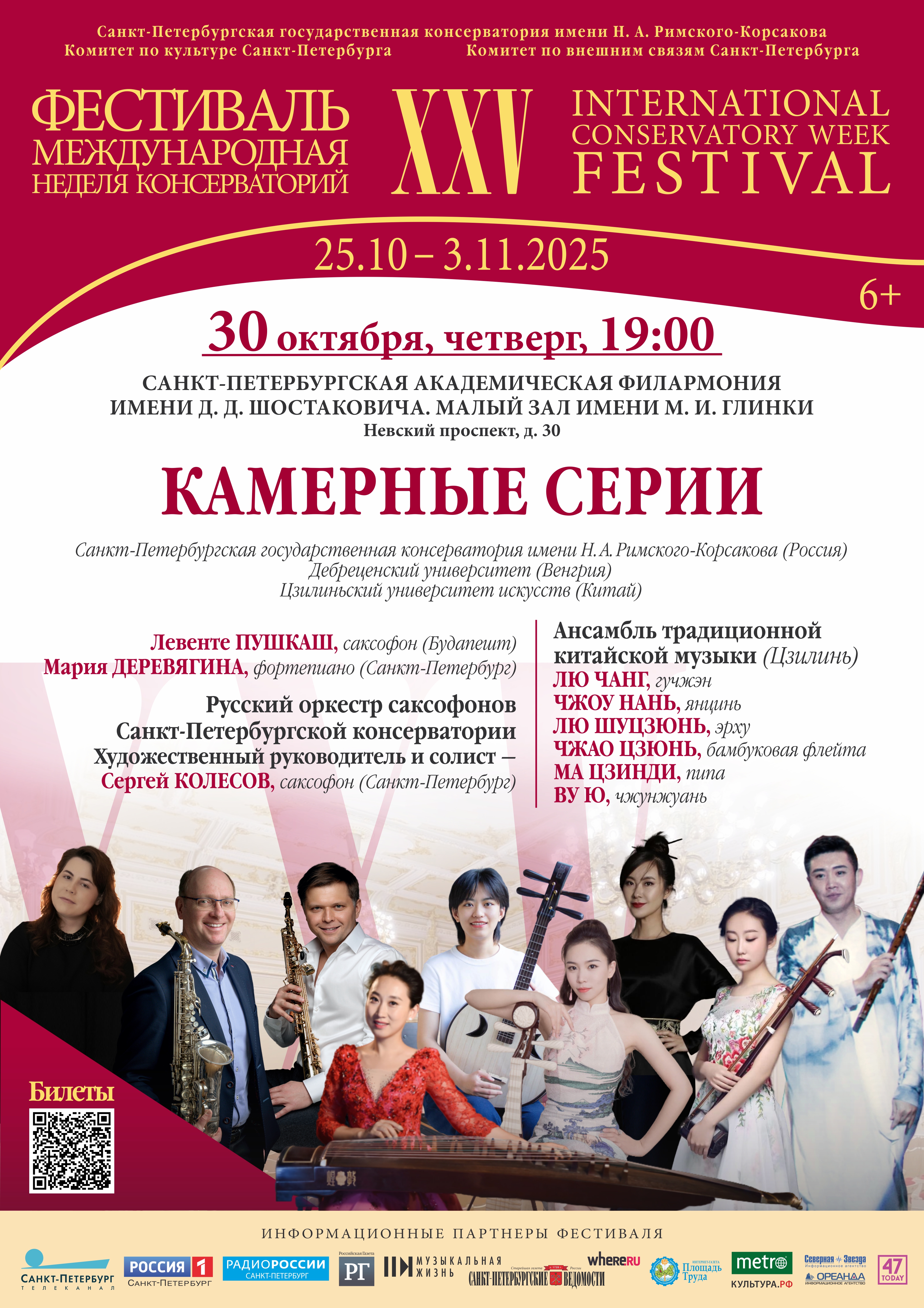 На юбилейном фестивале в рамках цикла «Камерные серии» свое мастерство продемонстрируют исполнители из России, Китая и Венгрии. Звучание классических и национальных сочинений стран Европы и Азии, а также фестивальные премьеры произведений, не исполнявшихся ранее на петербургских концертных подиумах, придадут программе особый колорит и, безусловно, запомнятся многочисленным петербургским слушателям. В первом отделении гости фестиваля смогут услышать Ансамбль традиционной китайской музыки, во втором — саксофонистов Левенте Пушкаша (Венгрия) и Сергея Колесова (Россия), а также Русский оркестр саксофонов Санкт-Петербургской консерватории.