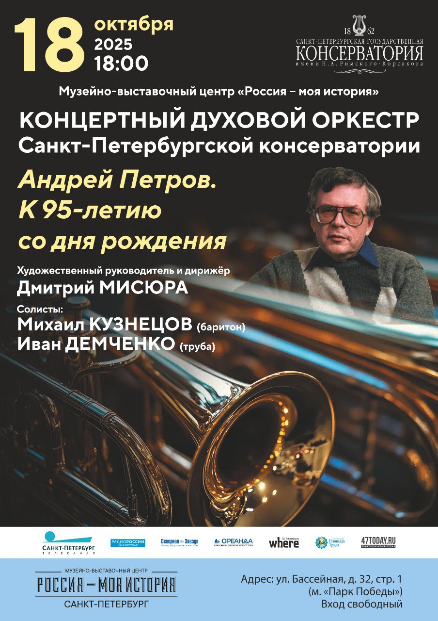 Концертный духовой оркестр Санкт-Петербургской государственной консерватории приглашает на концерт , посвящённый 95-летию со дня рождения композитора Андрея Петрова.