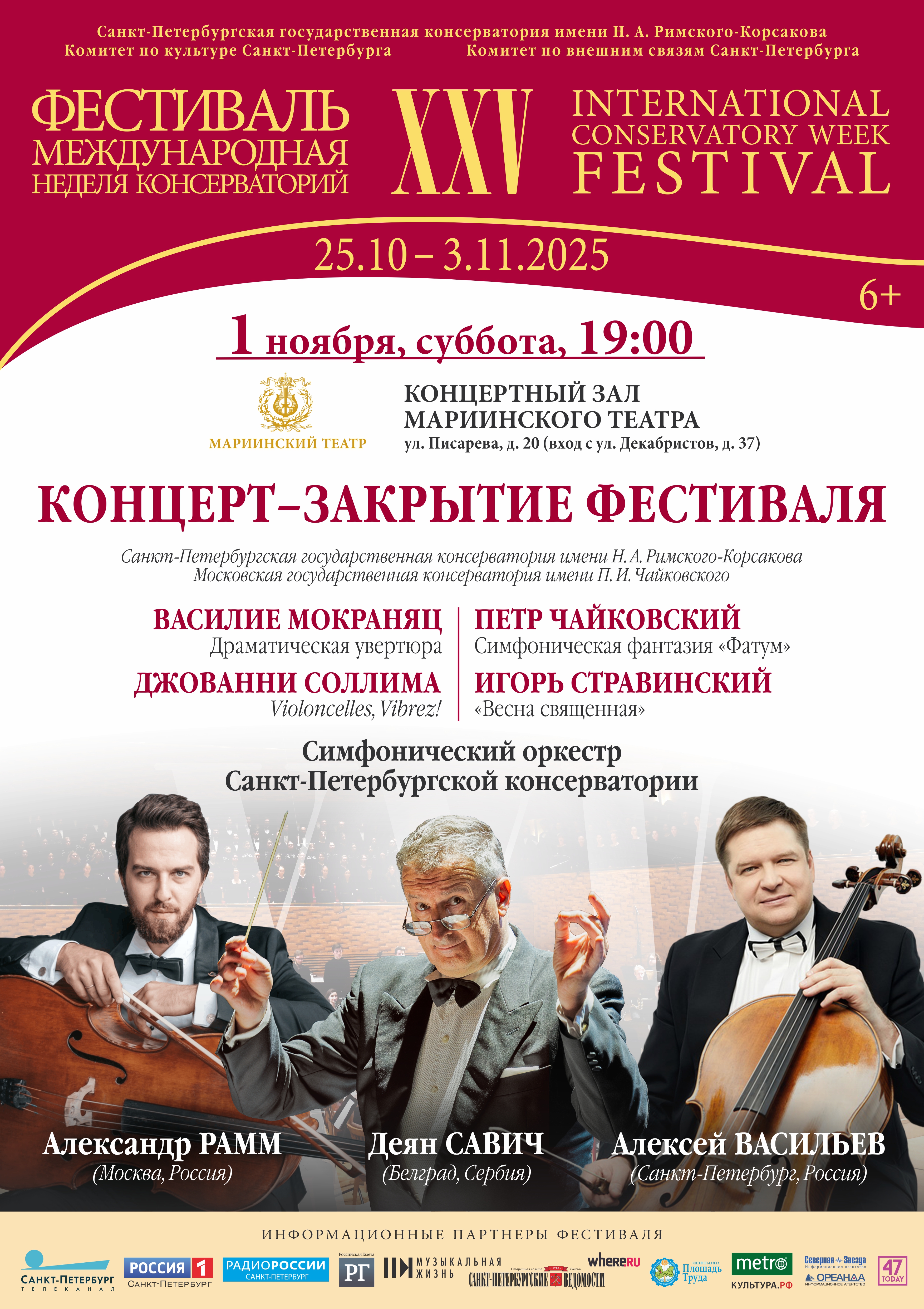 Юбилейный фестиваль завершится выступлением Симфонического оркестра Санкт-Петербургской консерватории под управлением двух маэстро: советника президента Сербии по культуре Деяна Савича и ректора Санкт-Петербургской консерватории, заслуженного артиста России Алексея Васильева, который также выступит в ансамбле с прославленным российским виолончелистом Александром Раммом. В программе — Драматическая увертюра Мокраняца, “Violoncelles, Vibrez!” Соллимы, Симфоническая фантазия «Фатум» Чайковского и «Весна священная» Стравинского.