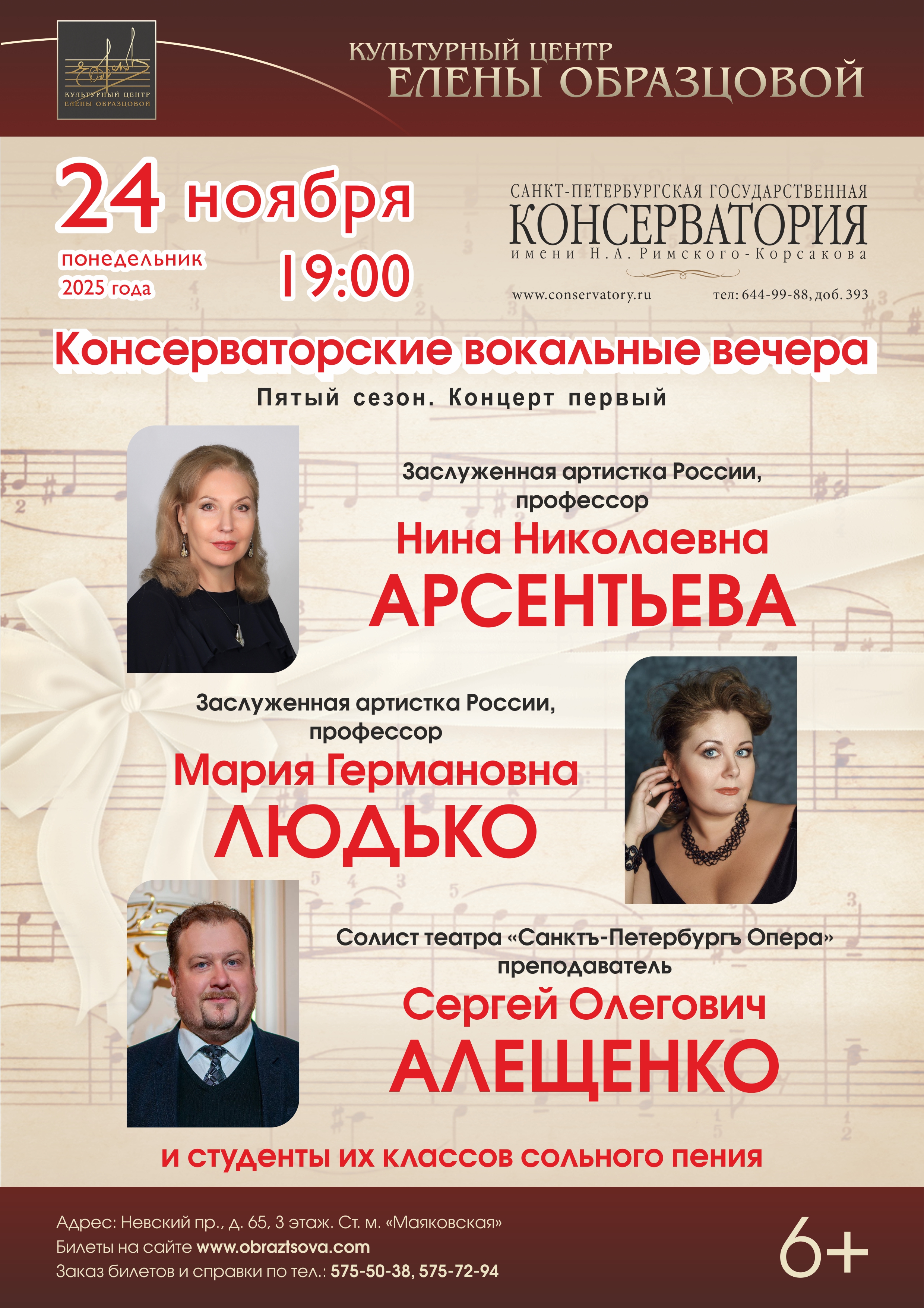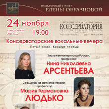 Открытие пятого сезона цикла «Консерваторские вокальные вечера» подготовили студенты и ассистенты-стажеры классов сольного пения заслуженных артистов России, профессоров Нины Николаевны АРСЕНТЬЕВОЙ и Марии Германовны ЛЮДЬКО, а также солиста театра «Санктъ-Петербургъ Опера», преподавателя Сергея Олеговича АЛЕЩЕНКО. В программе концерта прозвучат вокальные сочинения русских и зарубежных композиторов.