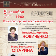Второй концерт сезона цикла «Консерваторские вокальные вечера» представит студентов классов сольного пения заслуженного деятеля искусств России, заслуженной артистки РСФСР, профессора Тамары Дмитриевны Новиченко, заслуженного работника культуры России, профессора Елены Васильевны Опариной и преподавателя Марии Анатольевны Бочмановой. В программе прозвучат камерно-вокальные сочинения и оперные арии русских и зарубежных композиторов.