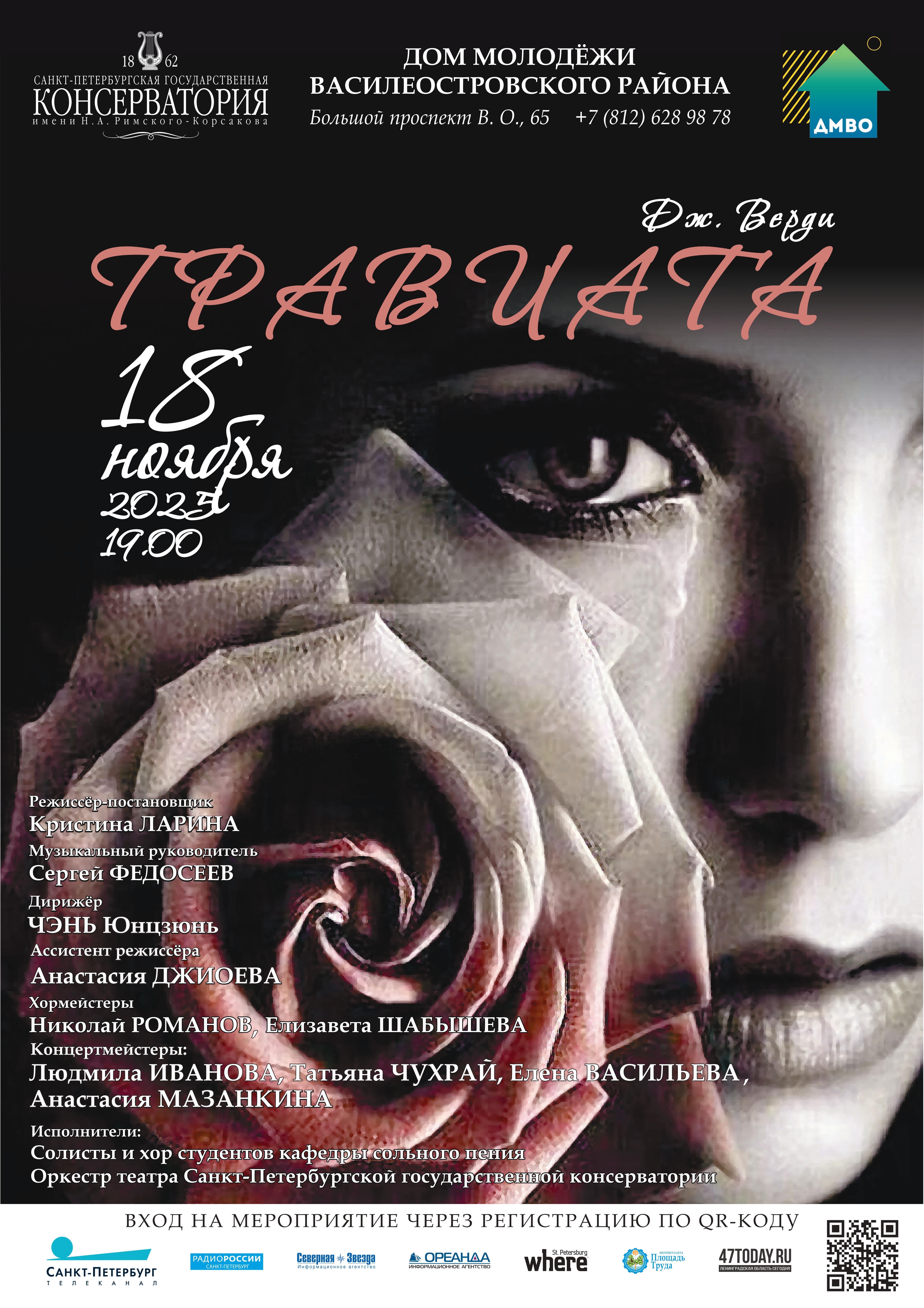 Опера Джузеппе Верди «Травиата» пережила в консерватории пять постановок. Первая состоялась в 1937 году (режиссер Таврог). Вторая - в 1962 году в режиссуре Теслера. В этом спектакле дебютировали студенты консерватории Константин Плужников и Владимир Атлантов, ставшие звездами мировой оперной сцены, а также выдающиеся деятели вокального искусства Кира Изотова, Тамара Новиченко и другие, известные в будущем певцы. В 1979 году оперу поставил Давид Косаковский. Именно в этой постановке дебютировала мировая оперная звезда Анна Нетребко. В мае 2019 года состоялась премьера нового спектакля под руководством Дарьи Жолнеровой. В мае 2023 года состоялась премьера постановки под руководством Кристины Лариной.