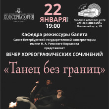 22 января 2026, в 19 часов, в Культурно- досуговом центре «Московский» кафедра режиссуры балета Санкт-Петербургской государственной консерватории имени Н.А. Римского - Корсакова представляет программу «Танец без границ».