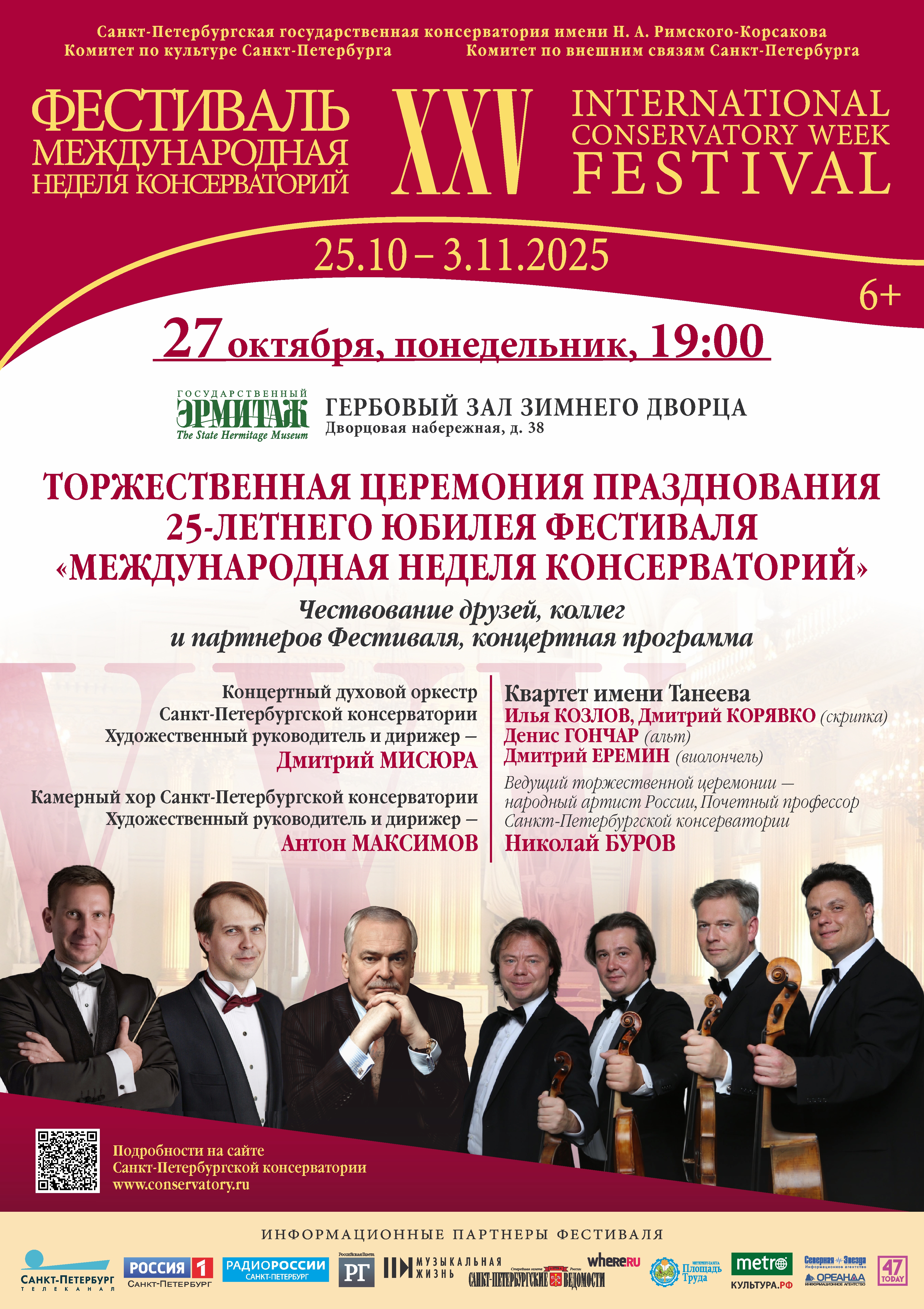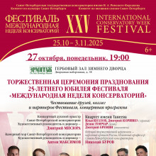 Одной из кульминаций 25-го фестиваля станет Торжественная церемония празднования юбилея «Международной недели консерваторий», в рамках которой состоится награждение юбилейными медалями многолетних партнеров и участников консерваторского проекта. В концертной программе примут участие Квартет имени Танеева, Концертный оркестр духовых инструментов и Камерный хор Санкт-Петербургской консерватории под руководством художественных руководителей Дмитрия Мисюры и Антона Максимова. Ведущий торжественной церемонии — народный артист России, Почетный профессор Санкт-Петербургской консерватории Николай Буров.