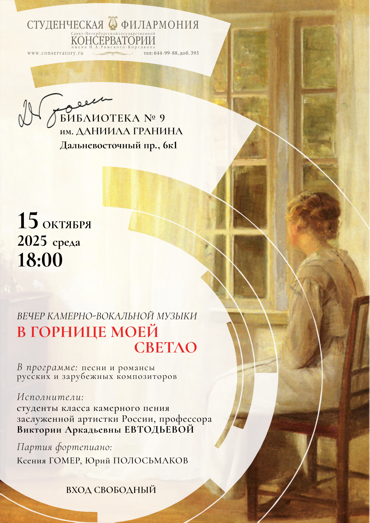 Яркая программа из шедевров мирового вокального репертуара будет интересна широкому кругу любителей музыки. На вечере произведения отечественных и зарубежных классиков прозвучат в исполнении студентов класса профессора Виктории Аркадьевны ЕВТОДЬЕВОЙ.