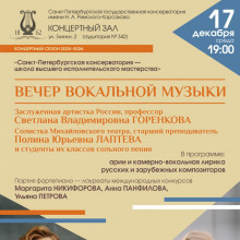 Героями концерта рубрики «Санкт-Петербургская консерватория — школа высшего исполнительского мастерства» станут заслуженная артистка России, профессор Светлана Владимировна Горенкова и солистка Михайловского театра, старший преподаватель Полина Юрьевна Лаптева. На сцене Концертного зала Санкт-Петербургской консерватории студенты их классов сольного пения представят вокальные сочинения признанных русских и зарубежных композиторов.