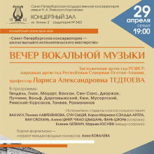 Заслуженная артистка РСФСР, народная артистка Республики Северная Осетия-Алания, профессор Лариса Александровна ТЕДТОЕВА представляет студентов своего класса, которые исполнят сочинения зарубежных и отечественных композиторов, чье творческое наследие оставило глубокий след в истории оперной и камерно-вокальной музыки.